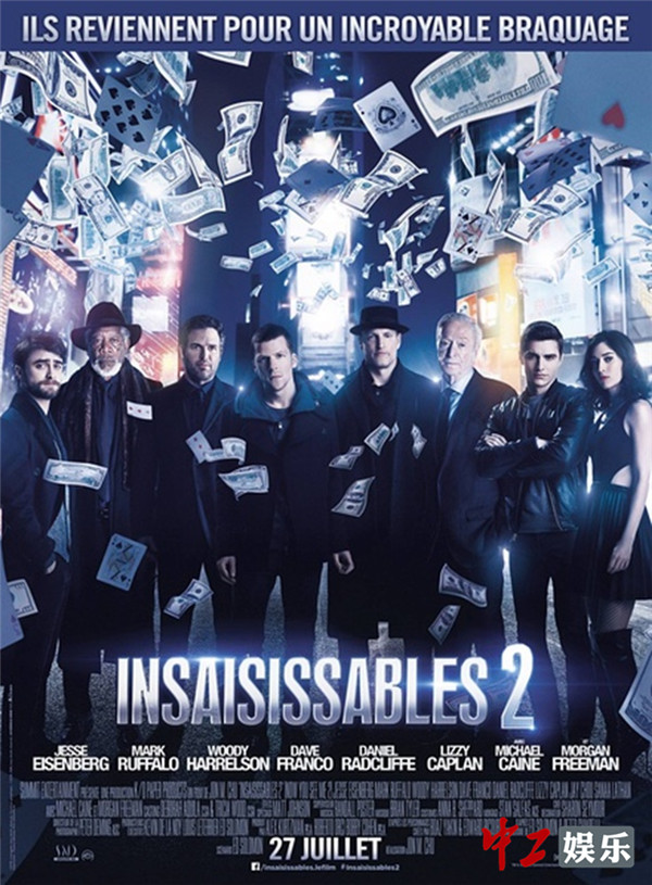 在各国海报中,分A、B两个版本的日本版海报显得创意十足。深蓝暗色系基调瞬间营造出一种神秘感,隐藏在幕后的神秘人物右手手握四张纸牌,每张纸牌分别是周杰伦、迈克尔·凯恩、摩根·弗里曼以及马克·鲁法洛。同时,神秘人右眼放光,似乎在笑又似乎在注视一切。而当神秘人露出左眼的时候,手上的纸牌又变成了四骑士,这些重量级角色竟全被掌握在一人手中,让人忍不住猜测,这个幕后神秘人到底是大反派丹尼尔·雷德克里夫还是四骑士背后的神秘天眼组织,这些疑雾重重的信息让人忍不住想去影片中一探究竟。