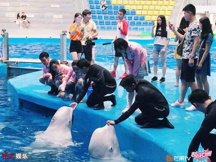 四位选手与海洋世界内的动物进行互动。