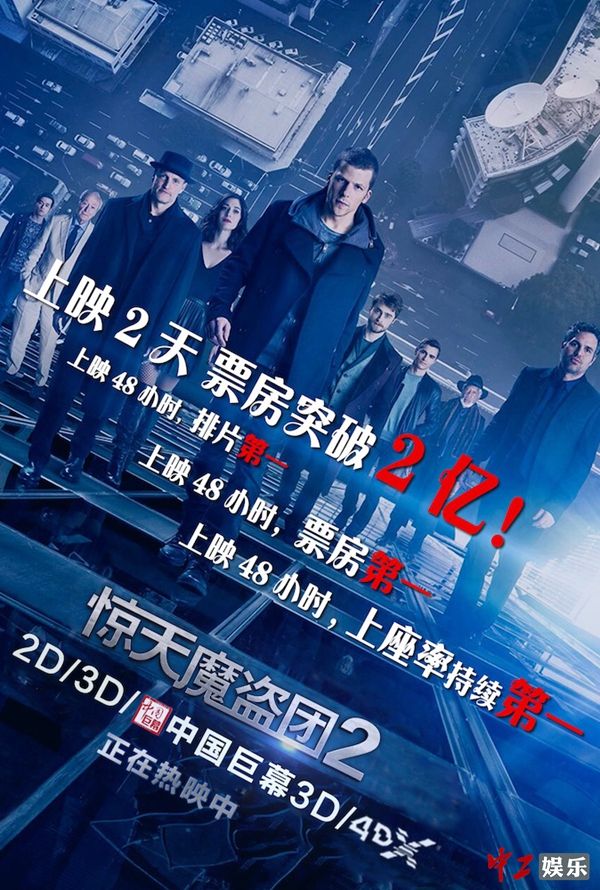 《惊天魔盗团2》由狮门影业重金打造,狮鼠影业协助推广,美籍华裔导演朱浩伟执导,杰西·艾森伯格、伍迪·哈里森、戴夫·弗兰科、丽兹·卡潘、“绿巨人”马克·鲁法洛、迈克尔·凯恩、摩根·弗里曼联合周杰伦、“哈利·波特”丹尼尔·雷德克里夫主演的高智商犯罪动作巨制《惊天魔盗团2》正在以2D、3D、4DX以及中国巨幕格式在内地热映。