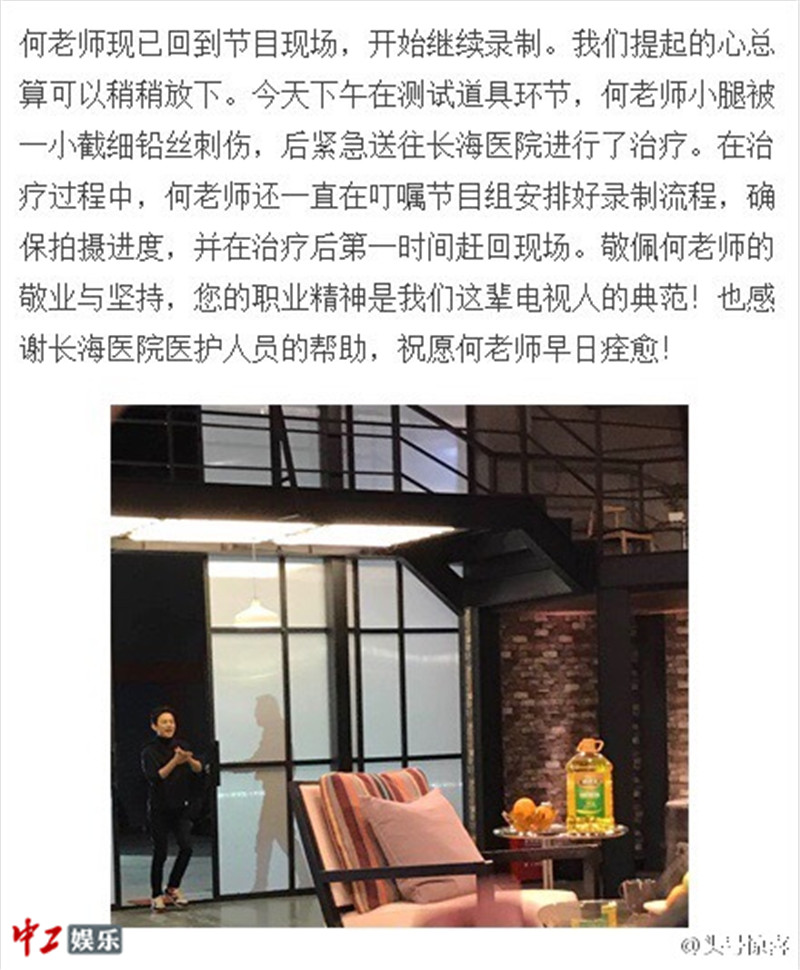 据知情人士透露,何炅是在录制湖南卫视第四季度全新综艺《头号惊喜》的过程中意外被异物扎伤,但伤势并不严重。不愿轻易下火线的何炅并没把这点伤放在心上,表示可以继续拍摄,但在导演组坚持先去医院就诊的要求下,何炅前往医院进行了激光定位的异物提取手术。目前,医生已经对伤口进行处理,伤势并无大碍。而处理完伤口的何炅,丝毫没有病人的样子,笑容灿烂地和医务人员们亲切合影。