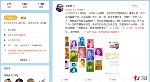 中工娱乐11月4日讯 由华为手机冠名的《梦想的声音》将于今晚在浙江卫视暖心开唱。作为一档向音乐致敬的电视节目,节目组极为用心,各个环节都力求完美。节目开播之际,浙江卫视节目中心副主任、《梦想的声音》总导演蒋敏昊在微博发表了对粉丝的一些心里话,让网友们感叹连连:“好的声音,从来都不怕久等!”