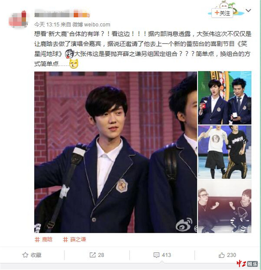 鹿晗此次成为大张伟首场演唱会的嘉宾,或许是他转变画风的一个契机,若此次他真的再次应大张伟之邀参加东方卫视《笑星闯地球》合体“新大鹿”组合,不管从整体演艺之路的发展、还是个人戏路的拓宽来说都是不可多得的机会。