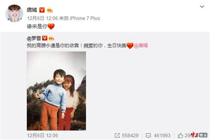 “我的肩膀是你永远的依靠!亲爱的你,生日快乐!”罗晋在唐嫣生日当天12点06分掐点示爱,还附上了一张精心P过的“青梅竹马”照,随后唐嫣也甜蜜回应“缘来是你”,俩人刚互相认爱,就瞬间刷爆朋友圈,在微博热搜上也是居高不下。
