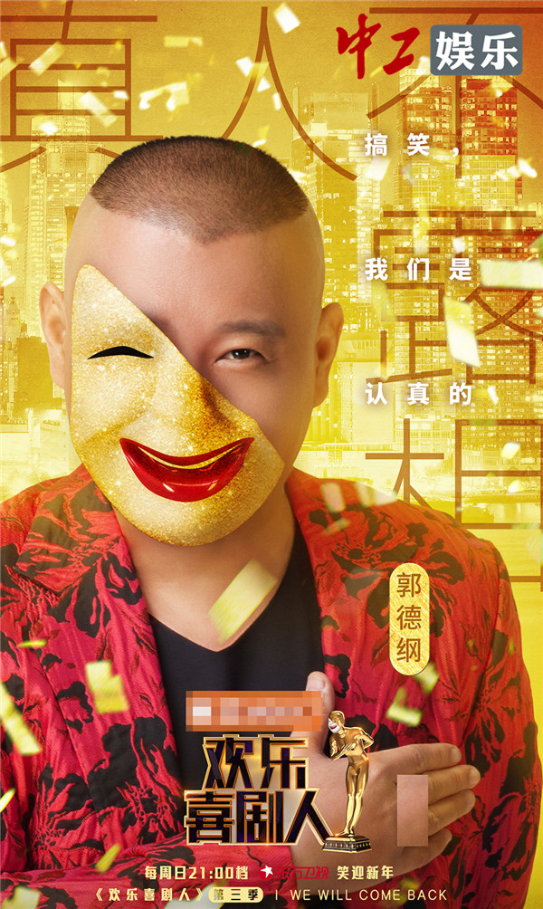 《欢乐喜剧人》第三季首次公开的阵容海报以绚丽的金色作为背景色,与“笑迎新年”这一主题全面贴合。在人物设计上,将郭德纲以及五位喜剧人用经典的小金人面具遮住了一半的面庞,只露出喜剧人们“带笑的眼睛”令人耳目一新,而每位喜剧人将手贴在胸前做出鞠躬的样子,更是凸显出了每位喜剧人“博君一笑”的诚意。《欢乐喜剧人》第三季即将全新起航,届时我们一起开年见喜!