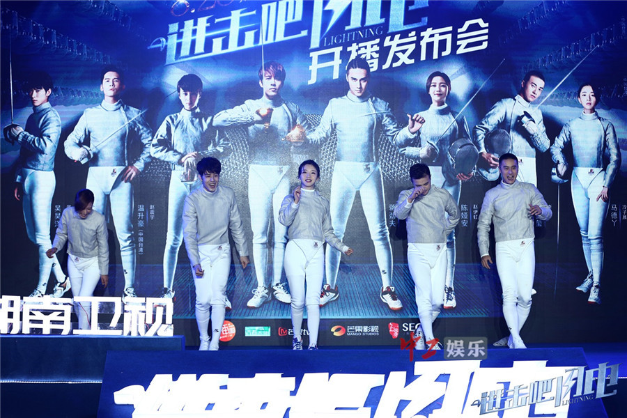 作为中国首部击剑题材的电视剧,《进击吧 闪电》的开播发布会处处彰显出“击剑天团”与众不同的“中二”调性:以击剑表演开场,开宗明义,凸显主题,四位主演和剧中轮番“尬舞”,中途气氛正酣时,甚至拉上剧中李琥的扮演者高玉玺一起“嗨”舞,最后几位主演的一场“鬼步舞尬演秀”瞬间引爆全场气氛。