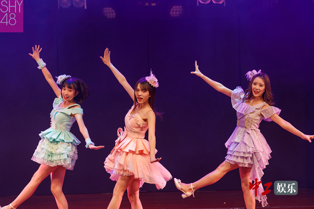 图为SHY48 TEAM SIII成员表演Unit曲《我们不是天使》(左起:TEAM SIII孙敏、韩家乐、刘娇)。