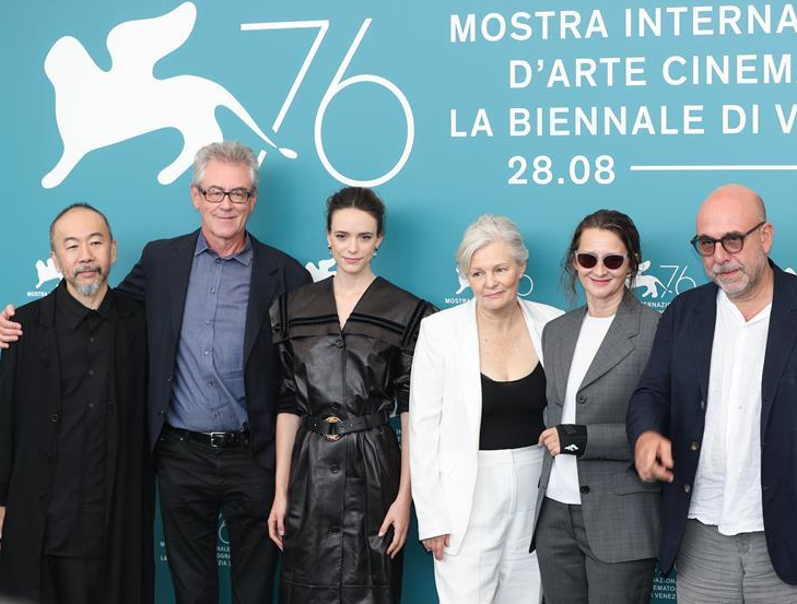 8月28日,在意大利威尼斯,第76届威尼斯电影节主竞赛单元的评委出席拍照式。第76届威尼斯电影节于8月28日至9月7日在意大利水城威尼斯举行。