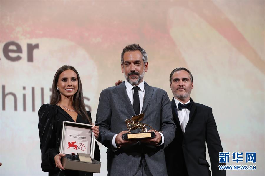 9月7日,在意大利威尼斯,导演托德·菲利普斯(中)上台领奖。 第76届威尼斯国际电影节7日晚在威尼斯利多岛落下帷幕,由美国导演托德·菲利普斯执导、杰昆·菲尼克斯主演的电影《小丑》获得最佳影片金狮奖。 新华社记者程婷婷摄