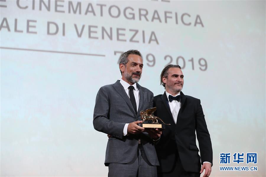 9月7日,在意大利威尼斯,导演托德·菲利普斯(左)与演员杰昆·菲尼克斯一同展示奖杯。 第76届威尼斯国际电影节7日晚在威尼斯利多岛落下帷幕,由美国导演托德·菲利普斯执导、杰昆·菲尼克斯主演的电影《小丑》获得最佳影片金狮奖。 新华社记者程婷婷摄