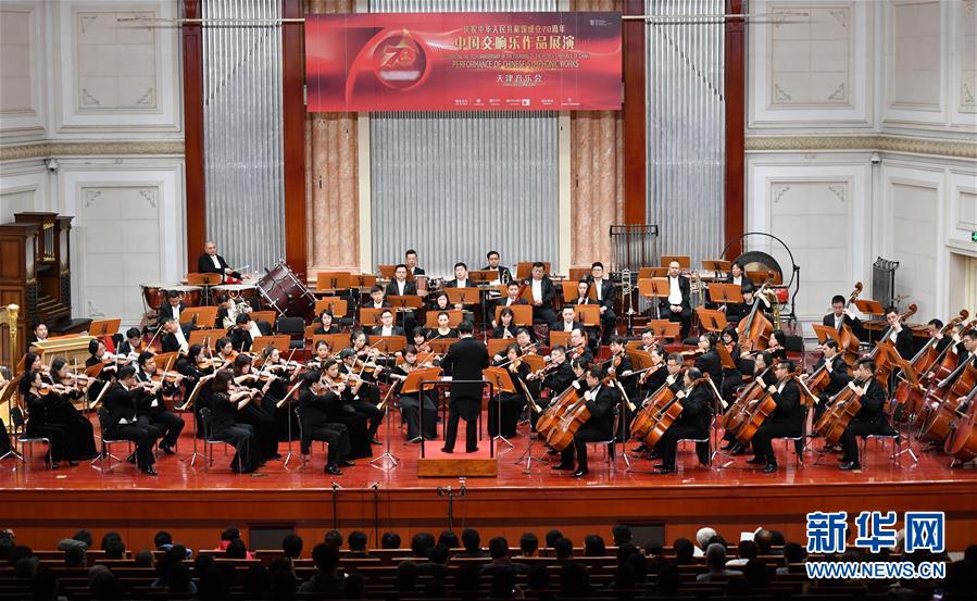 11月17日,天津交响乐团在演奏。 当日,“庆祝中华人民共和国成立70周年——中国交响乐作品展演”天津音乐会在天津音乐厅隆重上演。 新华社记者 李然 摄
