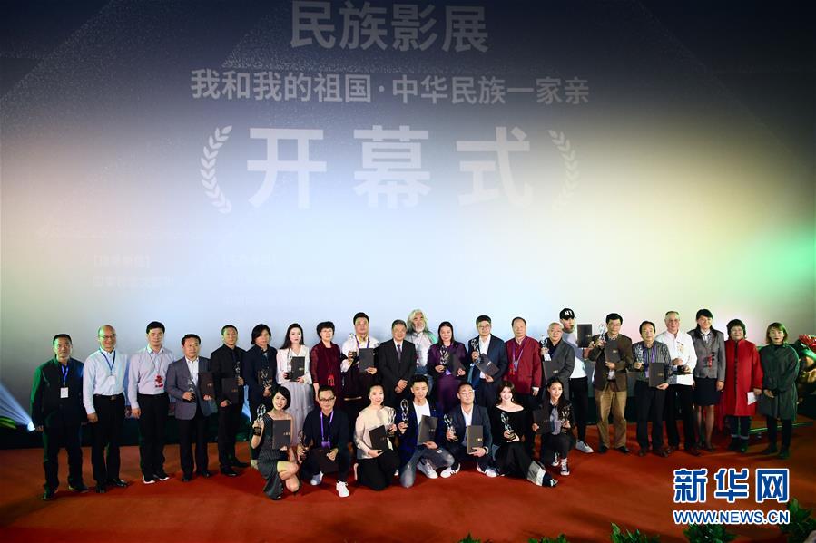 11月21日,在民族影展开幕式上,颁奖嘉宾与获表彰的民族影片主创人员合影。