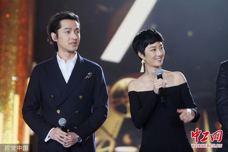 2019年11月25日,武汉,明星出席第十四届华语青年电影周晚会。胡歌、桂纶镁(图片来源:视觉中国 请勿转载)
