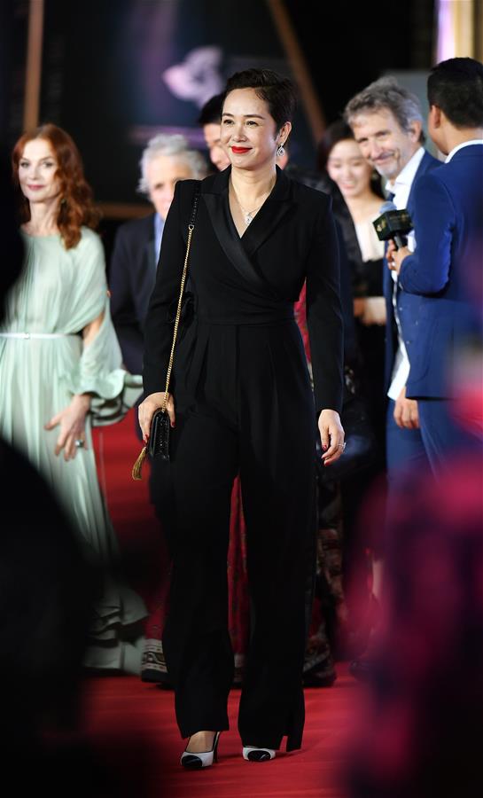 12月1日,演员蒋雯丽亮相电影节红毯仪式。 当日,第二届海南岛国际电影节在三亚开幕。 新华社记者 郭程 摄