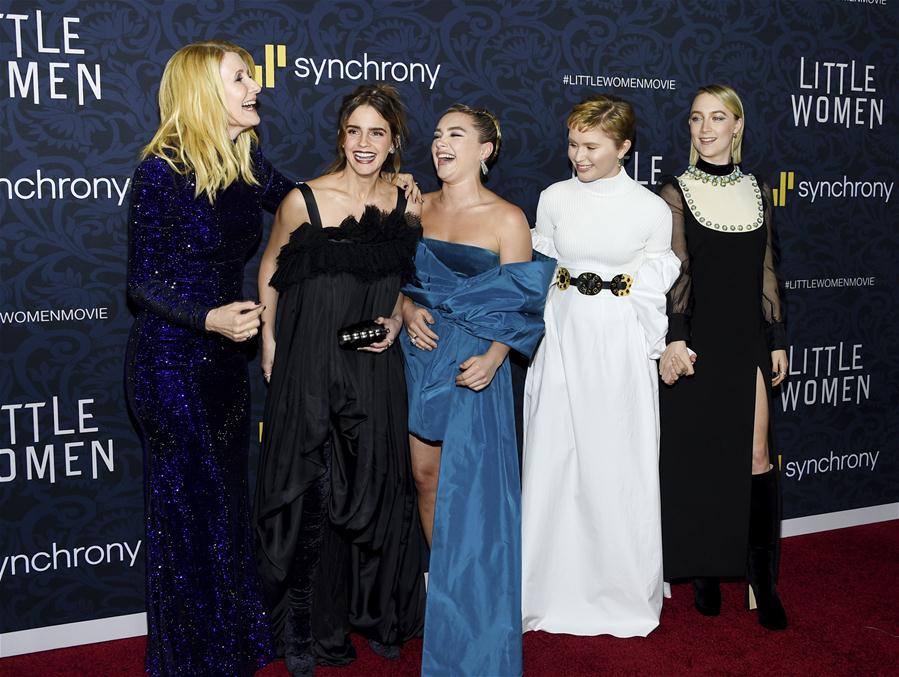 电影《小妇人》的主演(左至右)劳拉·德恩、埃玛·沃森、弗洛伦丝·皮尤、伊丽莎·斯坎伦和希尔斯·罗南出席首映式。 新华社/法新