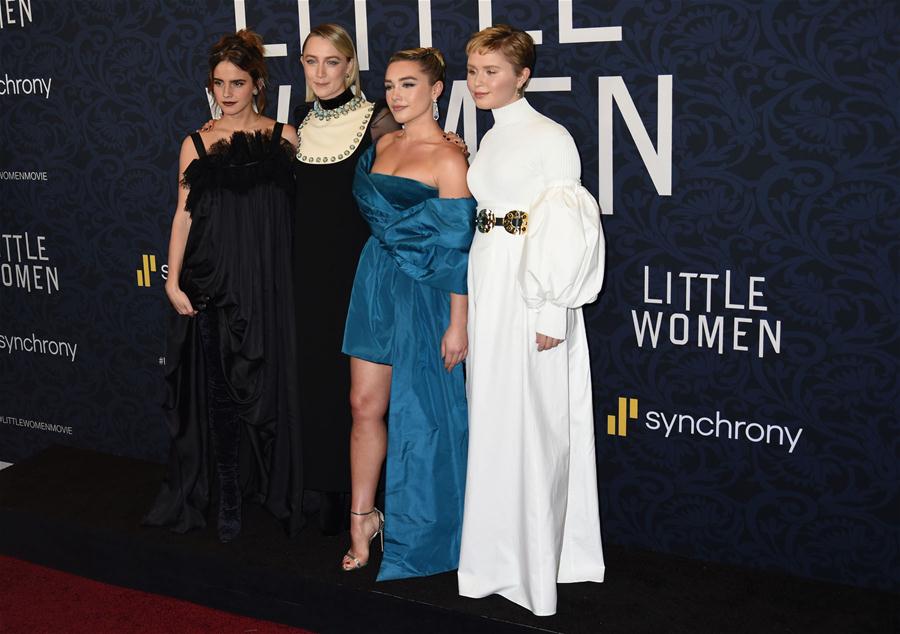 12月7日,在美国纽约,电影《小妇人》的主演(左至右)埃玛·沃森、希尔斯·罗南、弗洛伦丝·皮尤和伊丽莎·斯坎伦出席首映式。 新华社/西霸