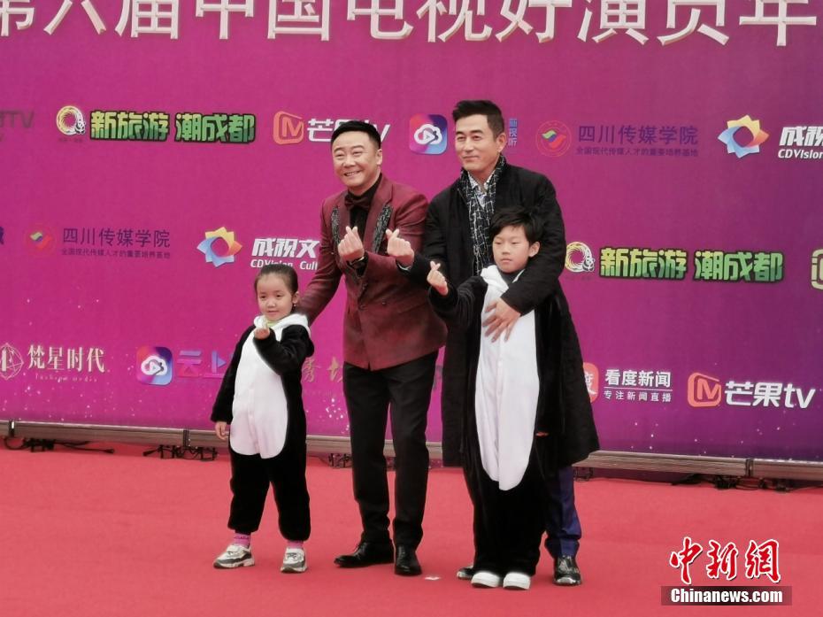 红毯上演员任正斌(左)和演员王志飞(右)与“熊猫宝宝”一同亮相。 何浠 摄