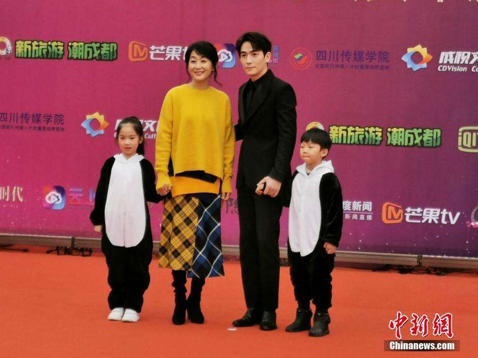 演员陈瑾(左)和演员朱一龙(右)与“熊猫宝宝”一同亮相。 何浠 摄