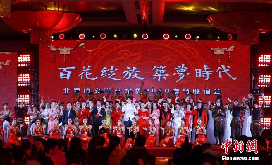 1月16日,“百花绽放 筑梦时代”北京市文联2020春节联谊会在北京饭店举行。600余名来自各艺术门类的文艺工作者代表欢聚一堂,共迎新春。图为演出结束后,演职人员上台向北京文艺工作者拜年。 中新社记者 贾天勇 摄