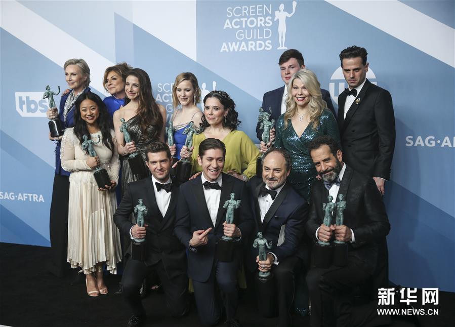 1月19日,在美国洛杉矶,夺得喜剧类最佳群戏奖的电影《了不起的麦瑟尔夫人》主创人员展示奖杯。新华社记者 李颖 摄