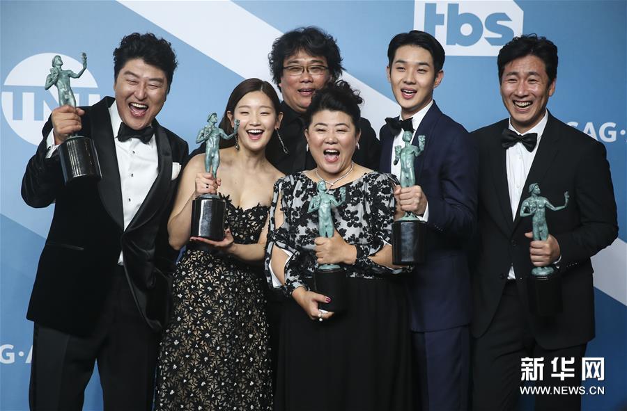1月19日,在美国洛杉矶,韩国黑色喜剧片《寄生虫》主创人员展示奖杯。新华社记者 李颖 摄