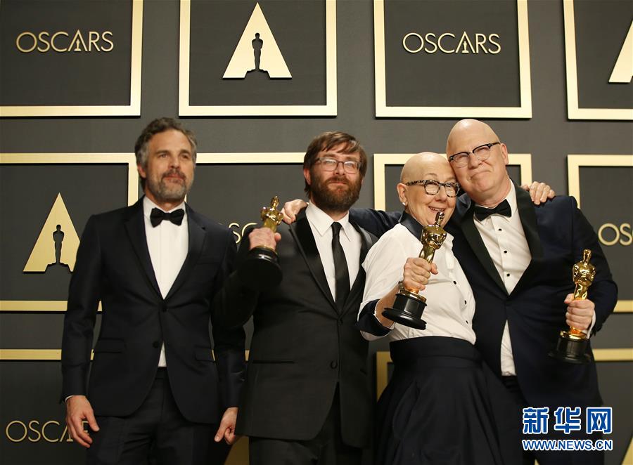 2月9日,在美国洛杉矶杜比剧院,获得最佳纪录长片奖的《美国工厂》主创人员展示奖杯。 第92届奥斯卡奖颁奖礼9日在美国洛杉矶杜比剧院举行。 新华社记者 李颖 摄