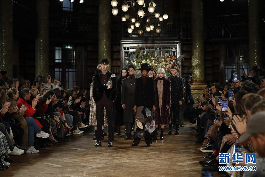 2月18日,在英国伦敦一家图书馆,模特在2020伦敦秋冬时装周上展示DAKS品牌服饰。 当日,2020伦敦秋冬时装周落幕。 新华社记者 韩岩 摄
