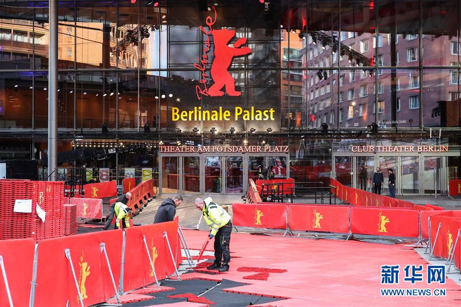 2月19日,在德国首都柏林,工作人员在第70届柏林国际电影节主会场柏林电影宫外布置。 第70届柏林国际电影节将于2月20日至3月1日举行。 新华社记者 单宇琦 摄