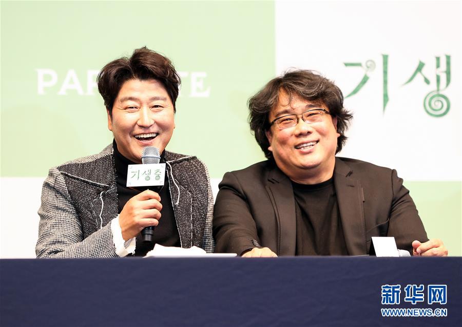 2月19日,在韩国首尔,影片《寄生虫》的主演宋康昊(左)和导演奉俊昊出席记者会。新华社记者 王婧嫱 摄