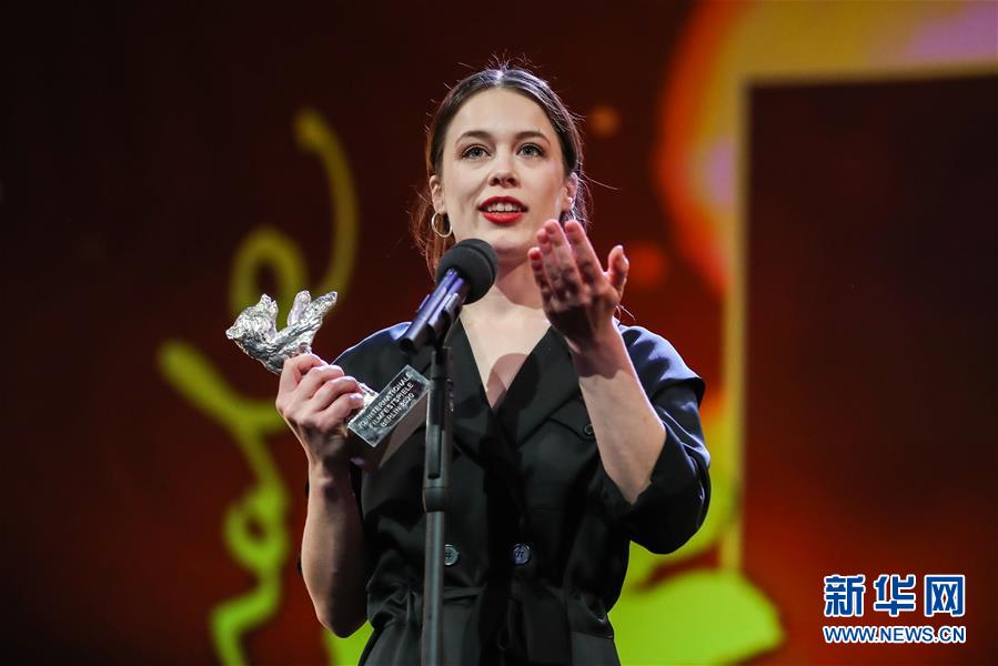 2月29日,在德国首都柏林,德国女演员葆拉·贝尔在颁奖仪式上发表获奖感言。葆拉·贝尔凭借影片《翁迪娜》获最佳女演员银熊奖。
