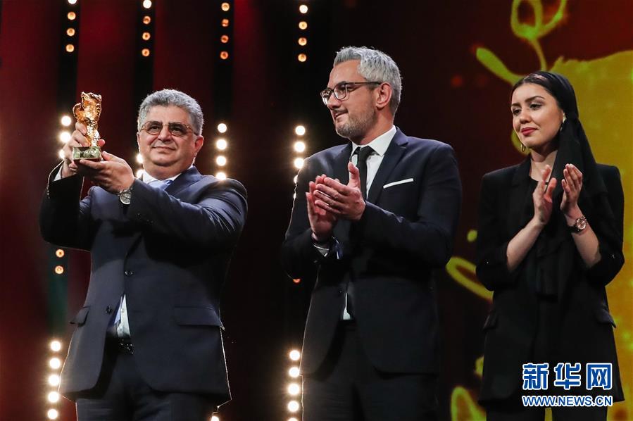2月29日,在德国首都柏林,获得最佳影片金熊奖的影片《无邪》制片人卡韦赫·法纳姆(左)、法尔扎德·帕克(中)与导演穆罕默德·拉苏洛夫的女儿巴兰·拉苏洛夫在颁奖仪式上庆祝获奖。 新华社记者 单宇琦 摄