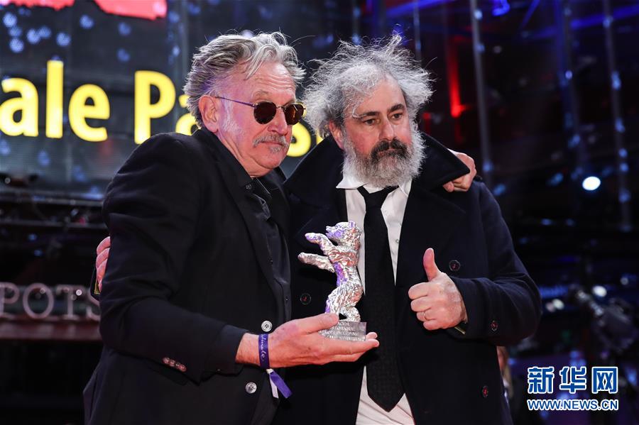 2月29日,在德国首都柏林,获得电影节70周年银熊奖的影片《删除历史》的导演兼编剧伯努瓦·德莱皮纳(左)与居斯塔夫·凯韦恩在颁奖仪式后亮相红毯。 新华社记者 单宇琦 摄