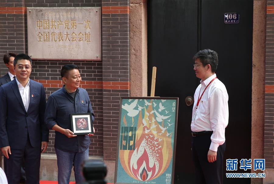 7月1日,电影《1921》导演黄建新(右二)向中共一大会址纪念馆馆方赠送首款电影海报。