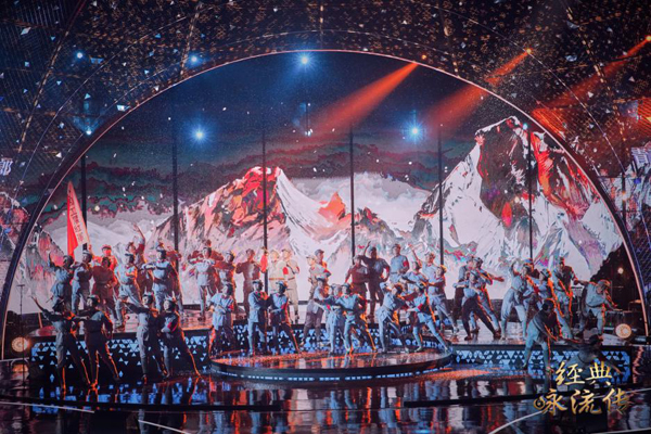 在《长征组歌》首演55周年之际,著名男高音歌唱家王宏伟携手老战友合唱艺术团来到《经典咏流传》,再次唱响这首气势磅礴的经典史诗,让众人热血沸腾。“雪皑皑,野茫茫,高原寒,炊断粮。”平均年龄超过70岁的老人们身着红军军装,依然站姿笔挺,用慷慨激昂的歌声再现了长征艰险的历程,也展现出红军战士不屈不挠的坚强意志。廖昌永感慨道:“《长征组歌》也在激励着我们一代又一代人不断地前进。”