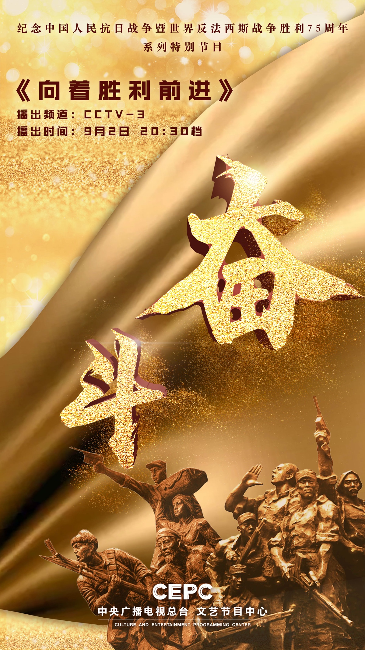 在电视端,大型专题文艺节目《向着胜利前进》将于9月2日 20:30开播。节目邀请温玉娟、徐涛、刘之冰、殷秀梅、刘琳、张英席等嘉宾,通过戏剧表演、诗歌朗诵等形式,再现抗战英雄的英勇事迹。节目通过老兵代表的采访,回首抗战历史,展望未来,并汇聚了75位抗战老兵,向逝去的战友和全国人民敬礼。同时,节目还集结了陆、海、空、火箭军、战略支援部队以及武警的8所军校优秀学员,通过“90”后新时代军人与“90”后抗战老兵的对话,传递历经75年而不褪色的抗战精神,追思民族信念的永恒,一同向着胜利前进!