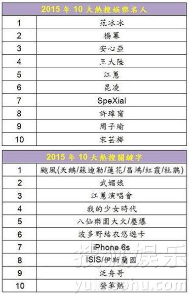 搜狐娱乐讯 日前,台湾Yahoo奇摩公布了2015年十大热搜娱乐名人榜单和2015年十大热搜关键字榜单,范冰冰凭借电视剧《武媚娘传奇》登上十大热搜名人榜榜首,而“武媚娘”亦成为了2015年十大热搜关键字的第一名。范冰冰和《武媚娘传奇》以高收视、强热度和好口碑,在台湾引起了不小的轰动。