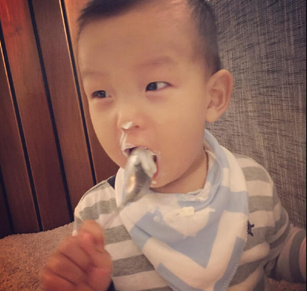 何洁儿子手拿勺子大口吃酸奶 模样呆萌可爱