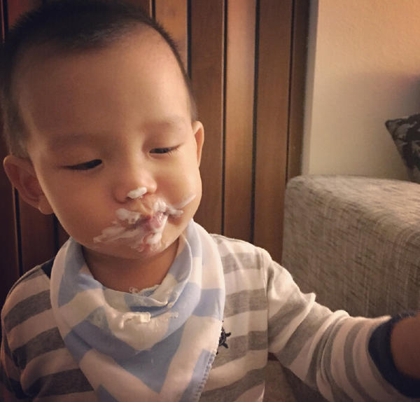 何洁儿子手拿勺子大口吃酸奶 模样呆萌可爱