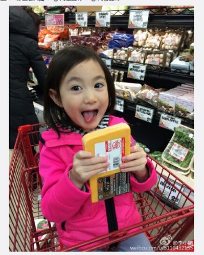 照片中,奥莉坐在商场的购物车中,手里拿着一大块芝士,开心得吐舌卖萌。网友看到照片后纷纷留言,“Cheese,快到奥莉的嘴里去”、“奥莉萌萌哒”、“小精灵”、“好Q一个小孩”。