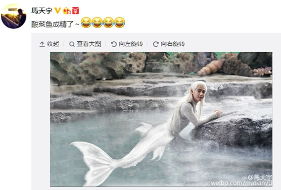 中新网1月21日电 昨日,马天宇在微博晒出新剧中的造型,还笑称,“酸菜鱼成精了”。照片中,他一头白色长发,身穿白色古装泡在水里,搞笑的事却长出了鱼尾,变成了男版美人鱼。