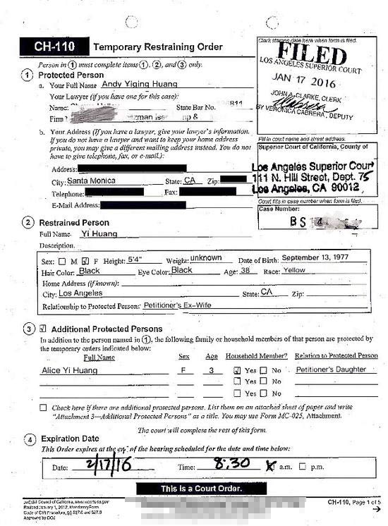 此前黄毅清曾表示将在美国委托律师起诉黄奕并申请保护令,会将收集到的黄奕虐女证据提交法院,并自信称黄奕没有胜算。1月25日,黄毅清通过微博曝光洛杉矶法院限制令,从图片看出,是一张临时限制单,被保护人黄毅清,受限制人黄奕,附带被保护人女儿alice,限制期为一个月,禁止黄奕探视女儿。不过随后,黄毅清删除此微博。