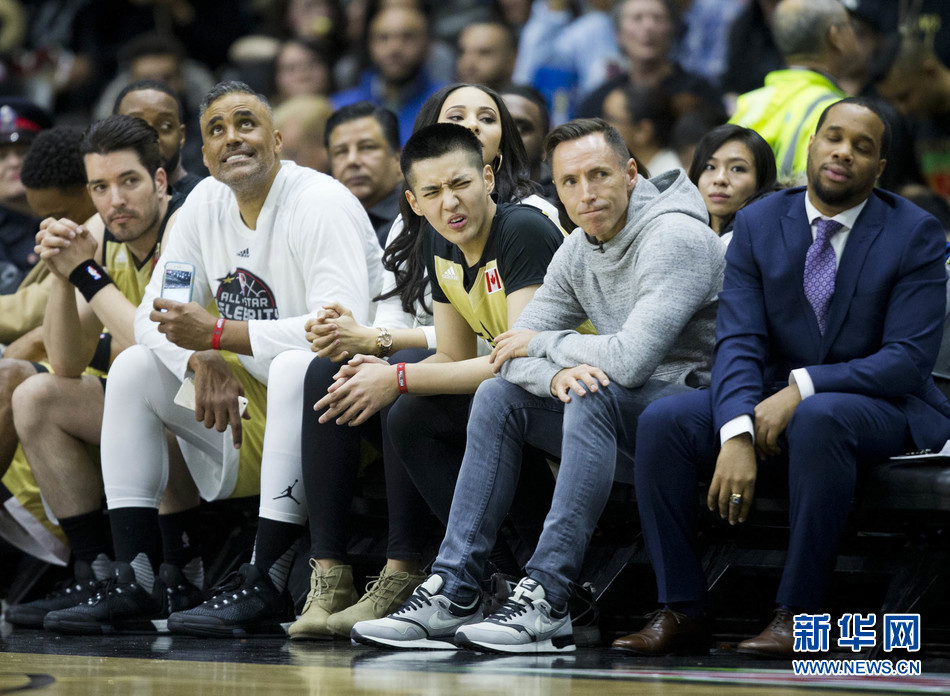 2月12日,吴亦凡场边看球特投入,队友上篮没进,他表情很到位。新华网发(邹峥摄)