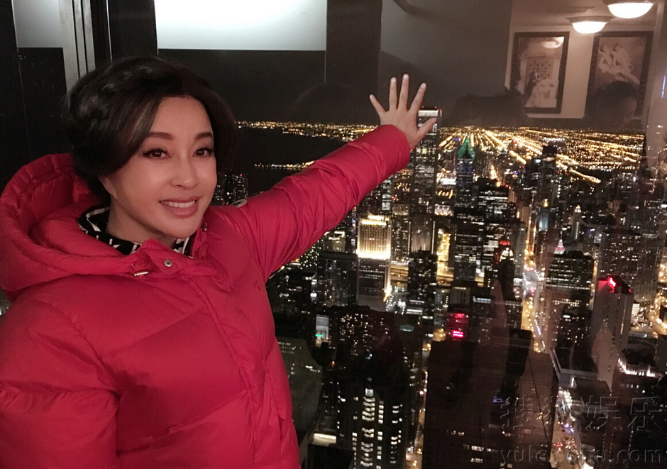 刘晓庆站在窗前,与卫生间窗外夜景合影。