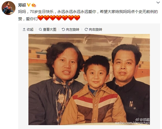 中新网3月7日电 近日,邓超在微博晒出与父母旧日合影,留言称,“妈妈,70岁生日快乐,永远永远永远永远爱你,希望大家给我妈妈点个史无前例的赞,爱你们”。照片中,邓超坐在父母中间,表情兴奋,而爸爸和妈妈则一脸温柔。