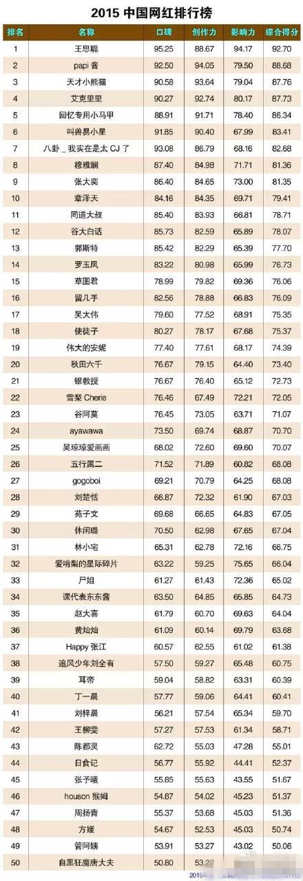 2015网红排行榜