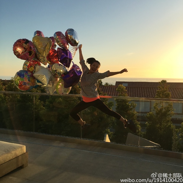 照片中,章子怡手拿一束氢气球做着各种伸展动作,最后竟然把气球放飞到了天上。