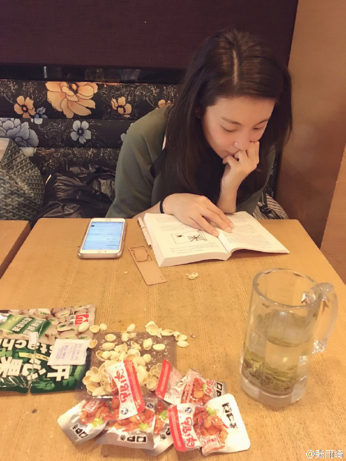 3月15日,张雨绮在微博晒出读书照,笑称“理想很骨感,现实超丰满”。原来,第一张照片中只是她和书、手机、杯子入镜,但后面的照片中,还把她吃完的很多零食果壳和袋子拍了进去。
