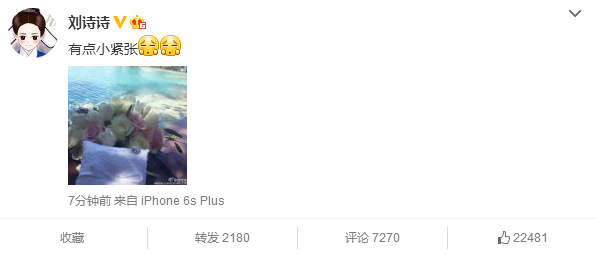 刘诗诗还难得在微博吐露真情,坦言自己“有点小紧张”,还加了两个可怜的卖萌小表情。网友纷纷送来祝福:“龙葵请你这辈子幸福下去!”“别紧张,我们在你身边护驾~”“祝福,永远幸福快乐。”