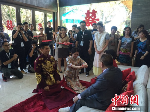 昨晚,众明星已经先于度假村举行了热闹的欢迎party,《步步惊心》群星合影,包括“皇阿玛”刘松仁。吴奇隆、刘诗诗正是因这部戏相识而陷入热恋。两人于2015年1月对外公布“领证”。本月,终于在外界的注目下“成婚”。