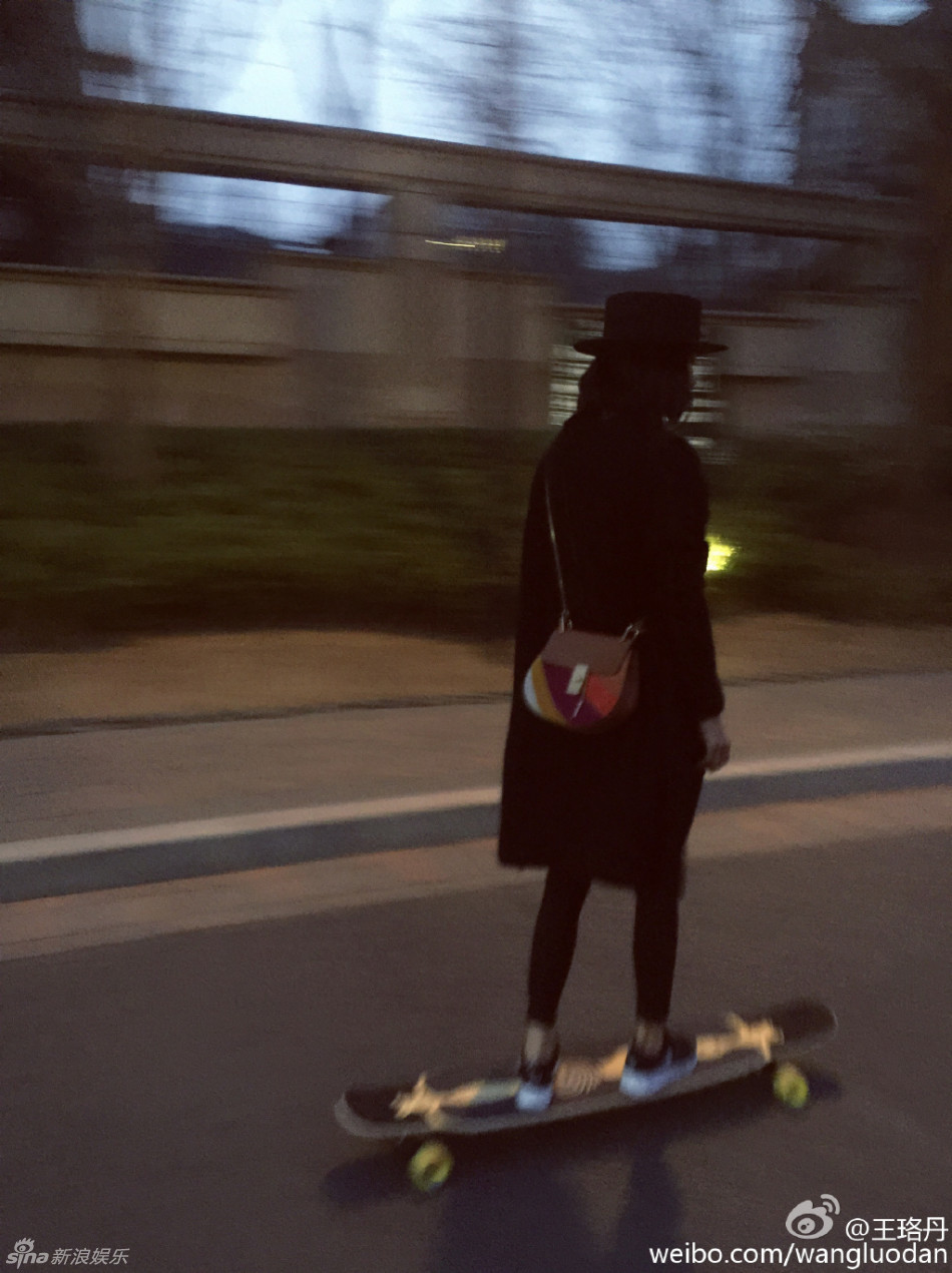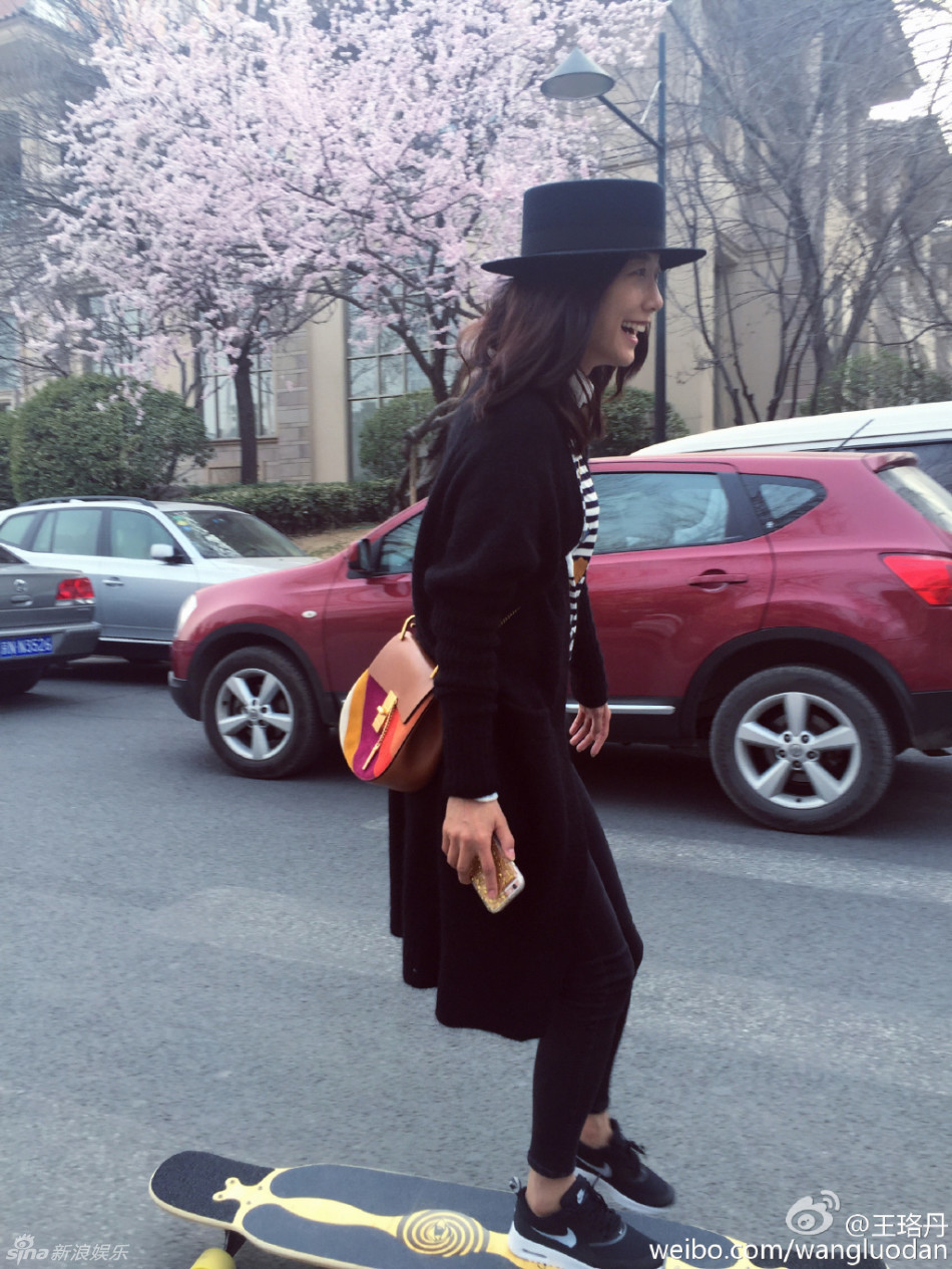 3月21日,王珞丹po出玩滑板的照片。一身黑色look的她打扮中性,秀出纤细的脚踝,滑滑板的姿势也看起来十分娴熟。