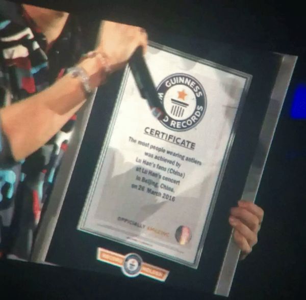当天现场尽管很多人都是头戴鹿角,但是由于吉尼斯世界纪录严格的要求,很多人没有计算在内。即便如此,最终经过现场核算和统计,本次鹿晗演唱会上同时戴鹿角头饰的人数是1731人,完爆挑战目标人数351人。这也是鹿晗的第三个吉尼斯世界纪录。鹿晗现场表示,这不应该算是他的,应该属于粉丝。